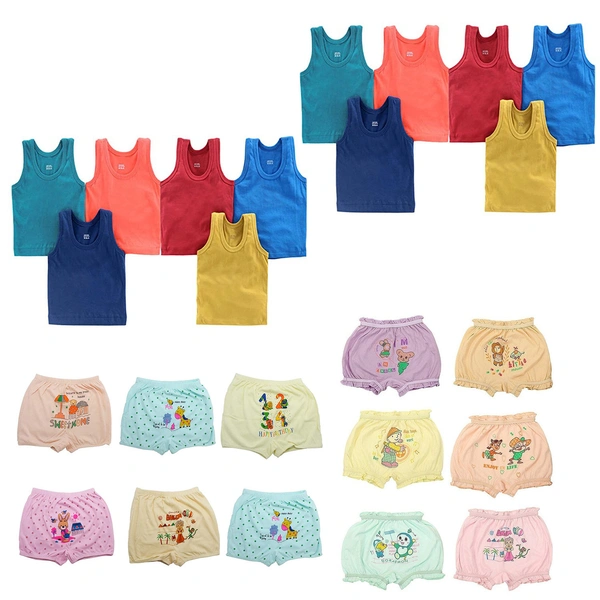 (0 Size) (Pack of 6 Vest, 6 Bloomers)) Set of Baby, Kids Inner Wear Vest & bloomers || Unisex Printed Cotton Panty || 100% Cotton Housiry With Cartoon Print